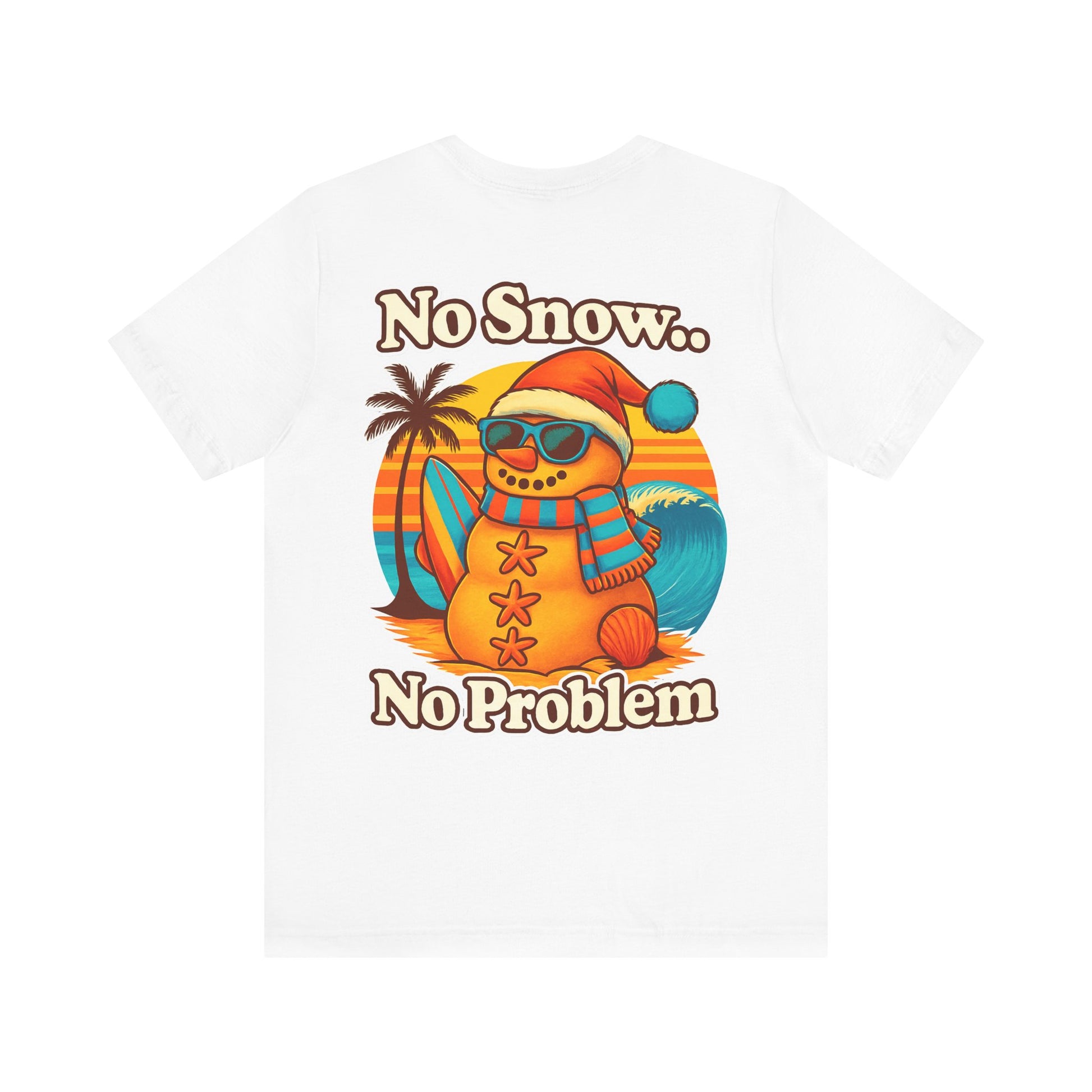 Our No Snow, No Problem tee brings tropical holiday vibes straight to the shoreline! Featuring a sun-kissed sand snowman rocking shades, a Santa hat, and a surfboard under a retro sunset — this design perfectly captures the Coastal Claus spirit.
