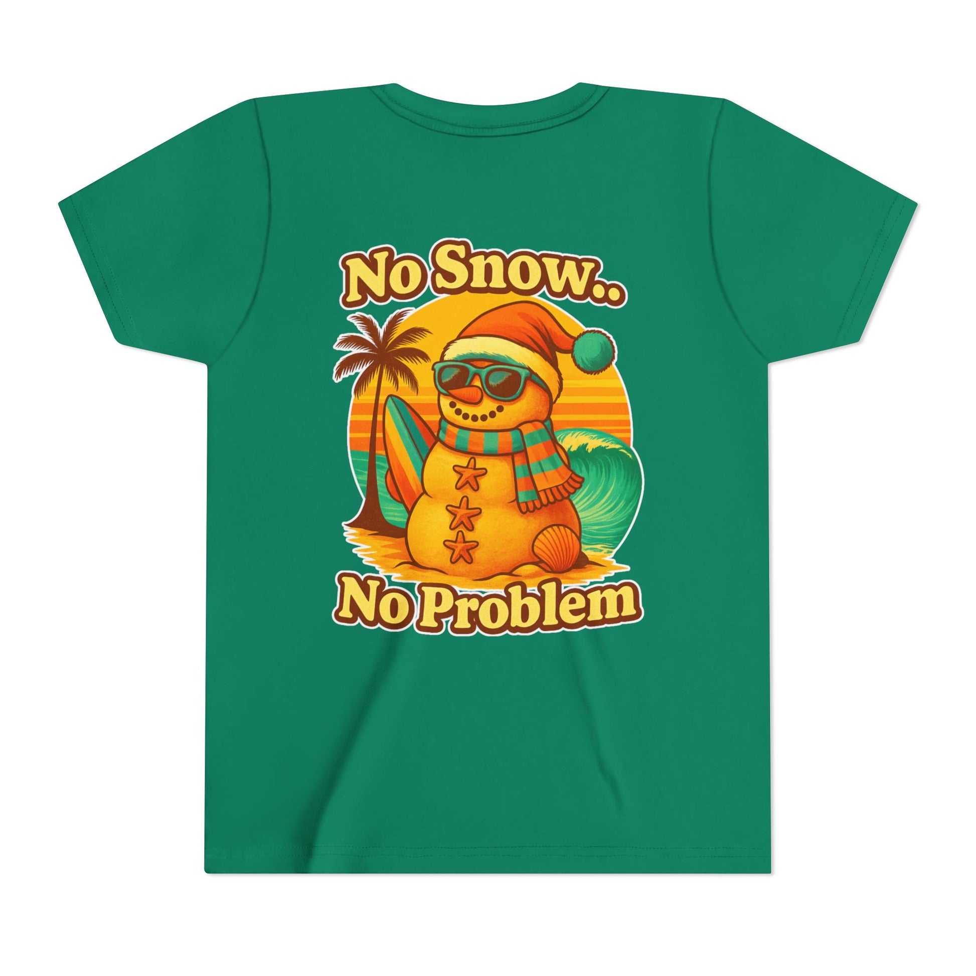 Youth Tee — "No Snow No Problem" Coastal Santa Surfing Snowman Kids Christmas Shirt